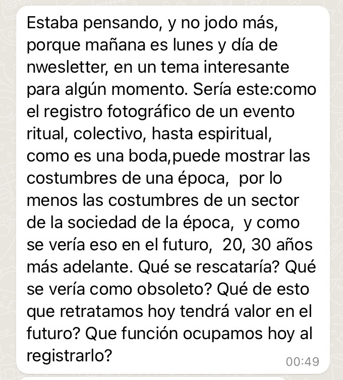 Volviendo al mensaje de mi madre a las 00:49 (ya ves de dónde viene esto del discurrir nocturno), pienso: ¿qué hay de obsoleto en esa foto? ¿Existe realmente la obsolescencia o es solamente una cuestión de que pase el tiempo? Porque dejame decirte que estamos a un tris de hacer esta misma foto, hoy, en este año que corre.